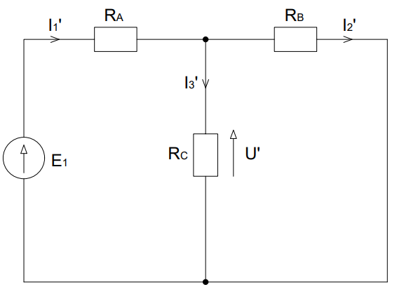 Llegados a este punto, cabe señalar que si en lugar de una fuente de tensión apareciera una fuente de corriente, estaríamos sustituyéndola por una interrupción en el circuito. Dado que las corrientes que circulan por el circuito serán la suma de dos componentes - la primera del circuito suministrada por la fuente, y el segundo con la fuente , la primera de las cuales marcaremos con "prim".