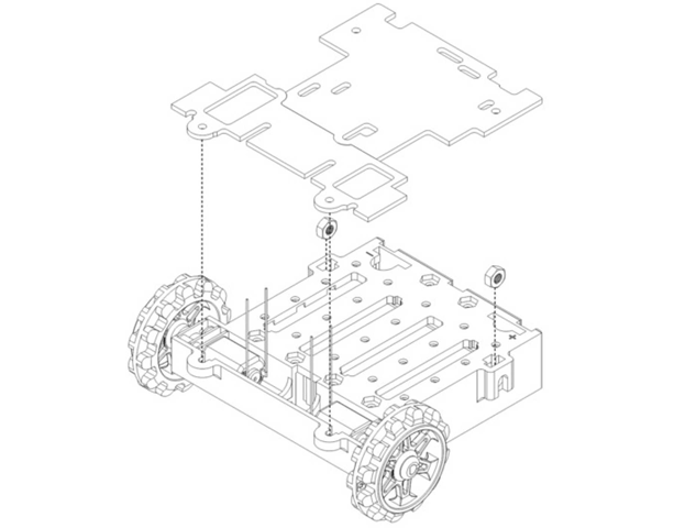 Cubre el chasis y los motores con una placa espaciadora negra. No olvides añadir dos tuercas M3 al paso de rueda delantero.