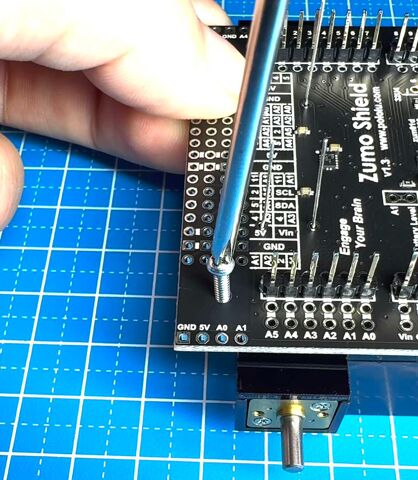 Suelda el zumbador y los conectores de Arduino al escudo Sumo. Asegúrate de recortar los cables en la parte posterior del tablero para que no impidan que el blindaje quede plano sobre el tablero espaciador y la carcasa. También puedes soldar otros sensores o componentes al escudo para agregar más funciones al robot y darle un toque personalizado.