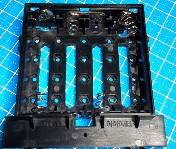 Gira la carcasa e instala los contactos del terminal de la batería como se muestra en la imagen a continuación. Las tres piezas con contactos dobles deben presionarse firmemente hasta que queden al ras con la superficie interior del compartimento de la batería. Se deben insertar dos contactos individuales en el compartimiento de la batería con sus lengüetas de soldadura sobresaliendo a través de los orificios en la parte superior de la carcasa. Puedes pegar temporalmente estos dos pines separados hasta que estén soldados al escudo como se describe en el siguiente paso, o puedes usar una batería para mantenerlos temporalmente en su lugar.