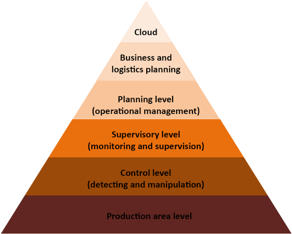 Las tecnologías relacionadas con M2M, IoT o su particular variante IIoT pueden ser suficientes para automatizar el proceso productivo, pero aún están lejos de la revolución mencionada en la introducción. Las revoluciones pueden ser desencadenadas por nuevas ideas que cuestionen el orden existente y propongan soluciones alternativas. Al planificar la automatización de una empresa de acuerdo con los principios de Industria 4.0, se puede utilizar un diagrama que generalmente se presenta en forma del llamado Pirámide de automatización. Analicemos los diferentes niveles de esta pirámide.