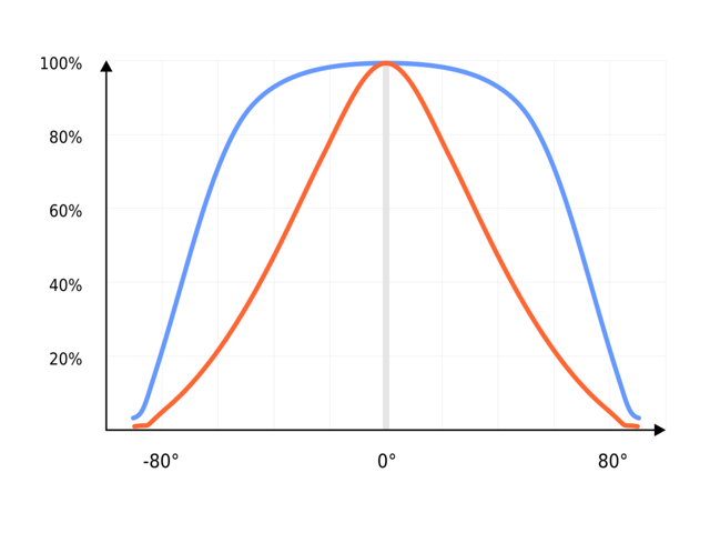 Dependiendo de la aplicación, la necesidad de espacio iluminado por infrarrojos variará. Se requiere un ángulo de emisión bastante estrecho para observar al conductor a través del ICMS (in-cabin monitoring system), mientras que la iluminación para el monitoreo debe cubrir toda el área vista por la cámara. Por eso la serie PK2S ofrece modelos con dos ángulos de iluminación: 80° y 140°. El diagrama (Fig. 1) muestra la intensidad de la iluminación en relación con la desviación del eje vertical del elemento: la línea roja para los LED de 80° y la línea azul para las variantes de 140°.