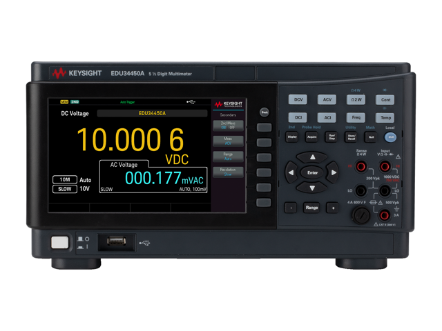 El multímetro digital Keysight EDU34450A tiene una resolución de 5 dígitos y medio, una precisión básica de 0.015% para voltaje CC y hasta 100 lecturas por segundo. El dispositivo, a pesar de su tamaño compacto, está equipado con una gran pantalla de dos colores de 7 pulgadas. El software PathWave BenchVue permite el control remoto del dispositivo y el registro de hasta 5,000 puntos de datos. Otras características de este producto son: