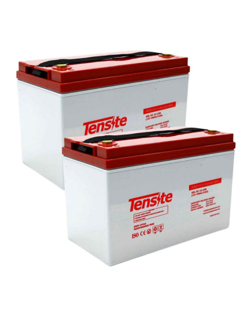 El Pack 2 unidades Baterías GEL 100Ah 12V Tensite es una de las mejores opciones para obtener un pequeño banco de baterías solares para poder cubrir consumos básicos en instalaciones fotovoltaicas de casas de campo o vehículos como caravanas o embarcaciones. Estas baterías GEL permiten al usuario almacenar la energía producida por el sistema fotovoltaico para su uso posterior, por ejemplo por la noche o en situaciones de emergencia.