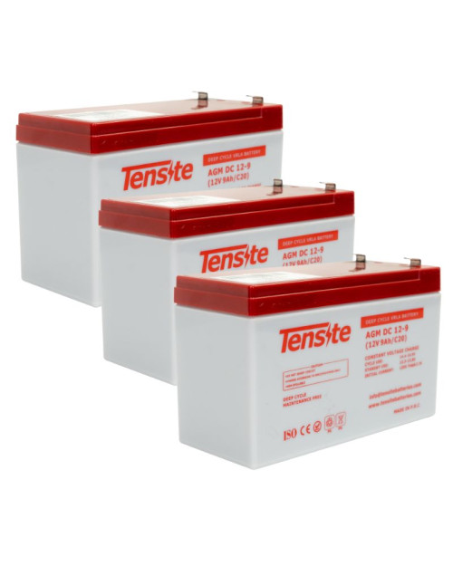 El Pack 3 unidades de Baterias AGM 12V 9Ah Tensite es perfecto para instalaciones fotovoltaicas o aplicaciones de bajo consumo. Estas Baterías AGM destacan individualmente por su diseño compacto y su poco requerimiento de mantenimiento. Integran tecnología VRLA y además, son perfectas para instalaciones en interiores o espacios reducidos. Con más de 800 ciclos de vida al 30% de descarga, destacan por su durabilidad y calidad-precio. Sus dimensiones de forma individual es de 151 x 63 x 94 mm facilitan su instalación en sistemas de iluminación o señalización.