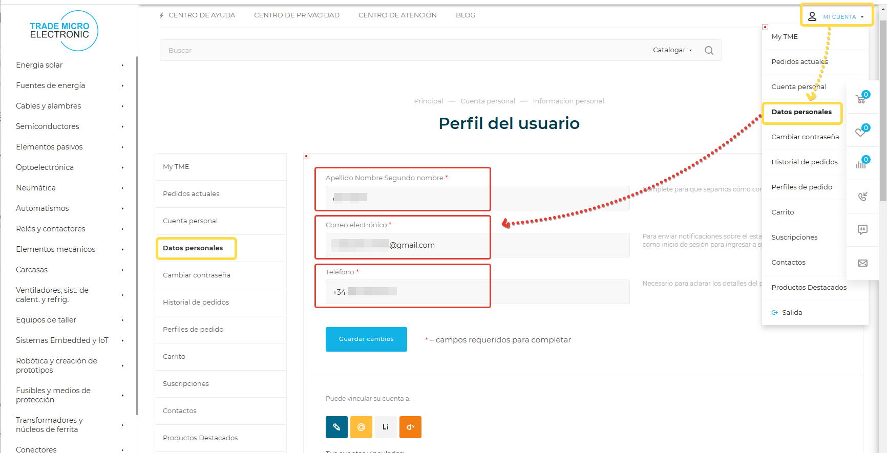 Si necesita actualizar su nombre de usuario, contraseña o cualquier otra información personal, inicie sesión en el sitio web www.components.tools y haga clic en el menú desplegable "Mi cuenta" en la esquina superior derecha; luego seleccione "Datos personales" si desea cambiar el nombre o seleccione "Cambiar contraseña" para cambiar la contraseña.