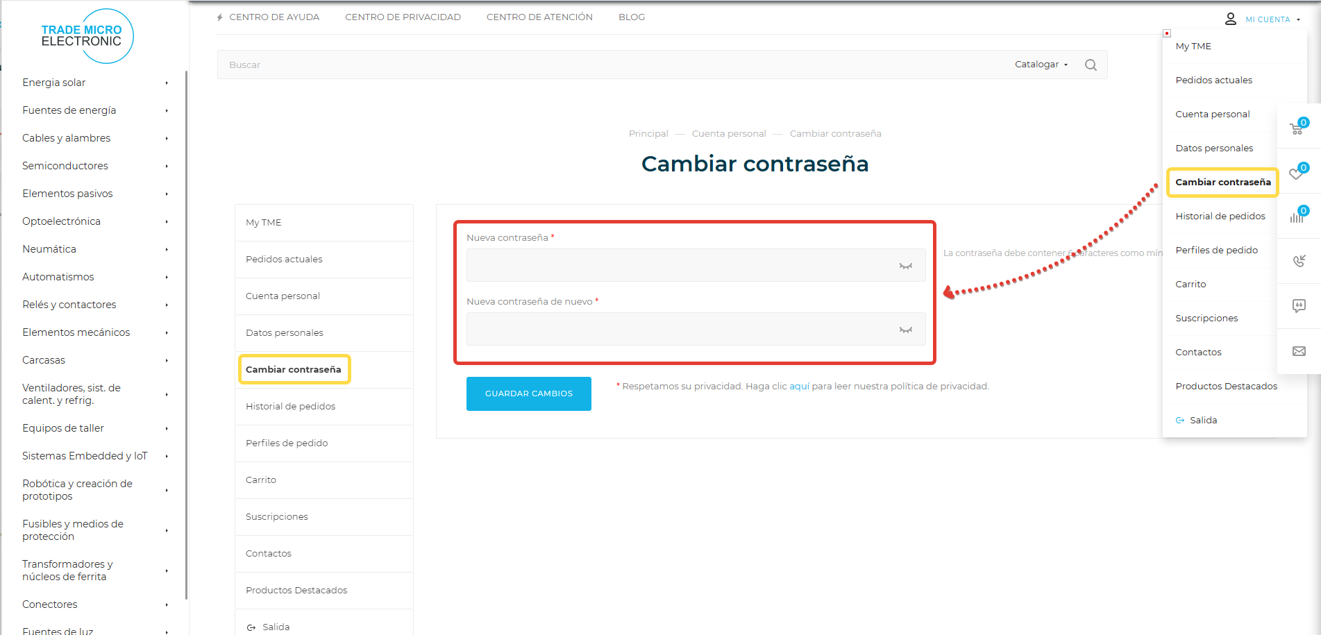 Si necesita actualizar su contraseña o cualquier otra información personal, inicie sesión en el sitio web www.components.tools y haga clic en el menú desplegable "Mi cuenta" en la esquina superior derecha; luego seleccione "Cambiar contraseña" para cambiar la contraseña..